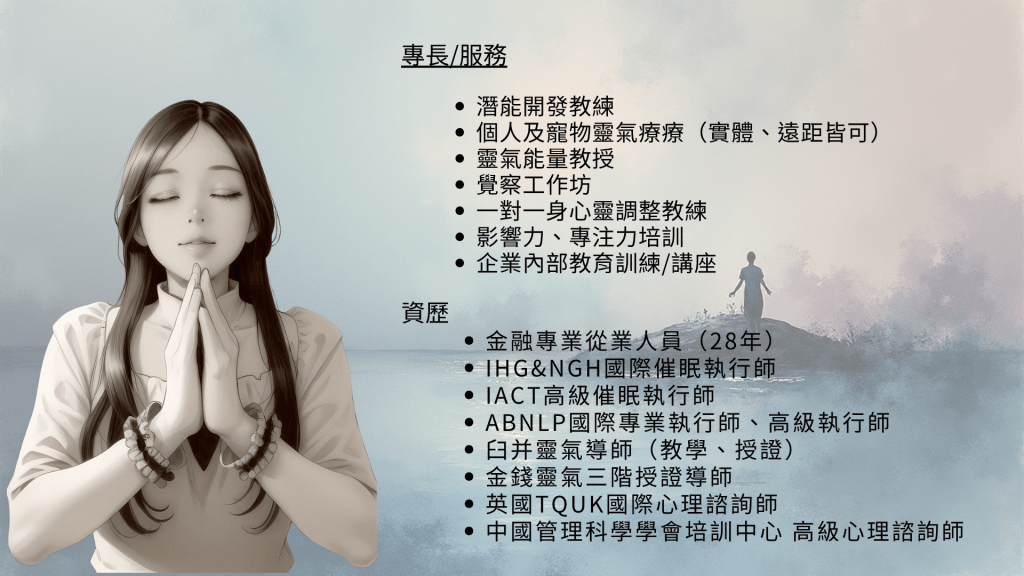 我將依個人專業能力結合臼井靈氣、NLP、西瓦心靈、NGH心理取向催眠、全腦開發全系列的培訓、紫微命理研習,提供專業知識、經驗和建議,提供個人及團隊,幫助學習專注、親子溝動方式及個人生活議題的建議,找回生命自信的力量。